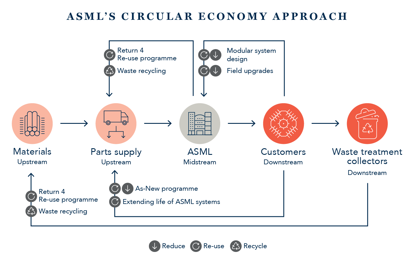 That all sounds good but how is it working in practice? As may be expected of an industry at the forefront of today’s technology, a number of companies within the semiconductor sector are pioneers in this transition to a circular economy. The semiconductor-component manufacturer ASML has taken substantial steps to realise its ambitions. Roughly 45% of its typical NXT system remains in place throughout numerous upgrade cycles. The company’s mature products and services business aims to refurbish and upgrade older lithography systems to extend their lifecycles, with 91% of total PAS systems ever sold still in use today, a testament to the company’s success and commitment to circular principles.