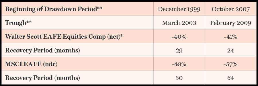 Source: Walter Scott, MSCI. Returns are shown in USD. *Net of fee returns reflect the deduction of model management fees and are calculated in the same manner as gross of fee returns. A 0.75% model management fee has been applied. **Drawdown periods have been defined by the benchmark. Recovery period is measured from trough of benchmark return for both composite and benchmark.