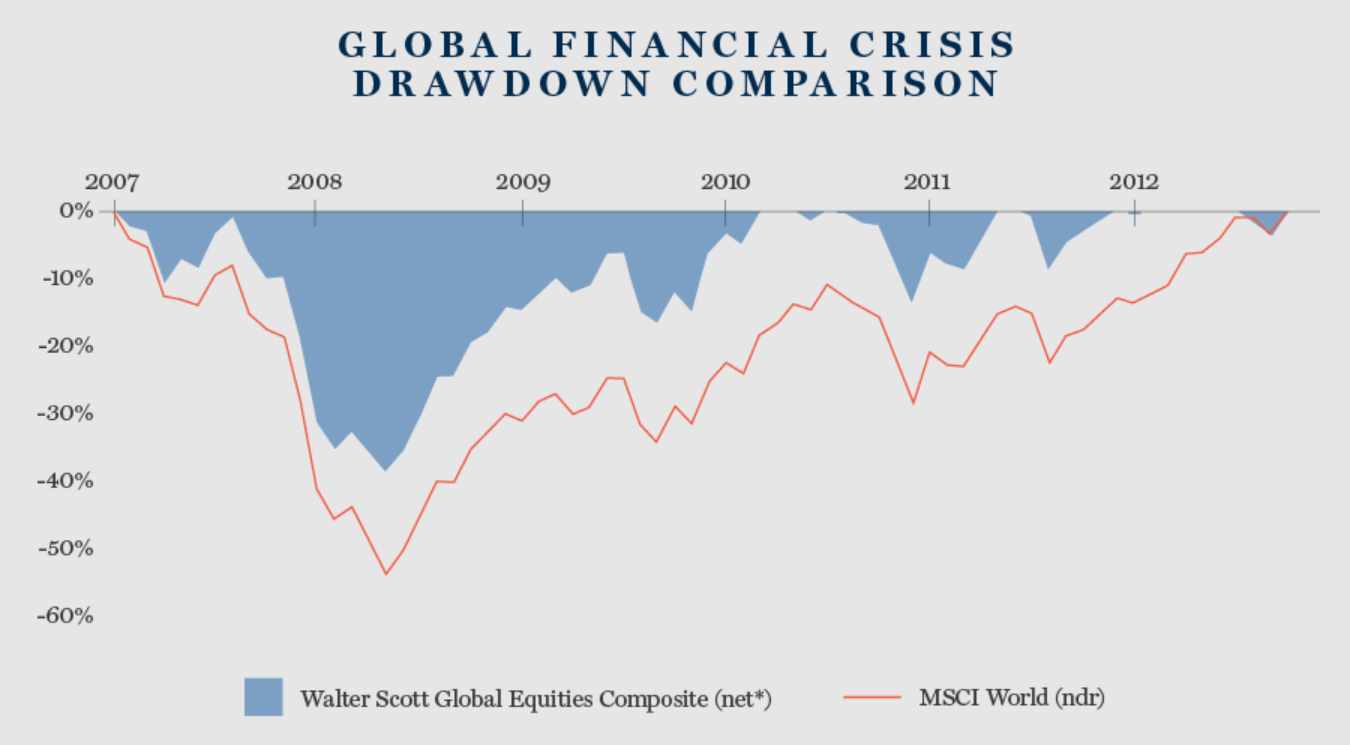Over the same period, Walter Scott’s Global Equity strategy drawdown was markedly lower at -39%.