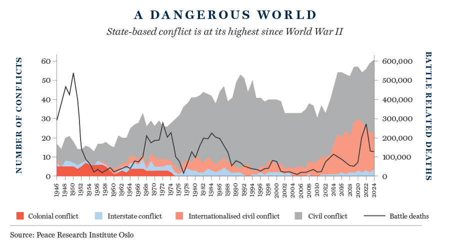 According to the Peace Research Institute Oslo, 2024 marked a historic peak in state-based conflicts, with 61 active conflicts across 36 countries – the highest number recorded since 1946. Given today’s proliferation of geopolitical tensions, it is hard to argue convincingly for this trend to meaningfully reverse in the medium term.