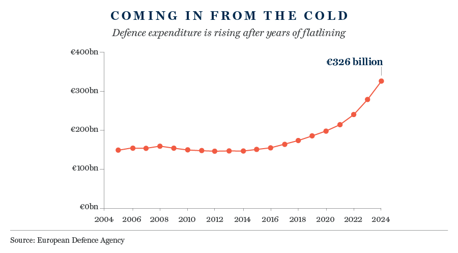 After years of underinvesting in its military capacity, Europe is rapidly increasing defence spending. Responding to the twin shocks of a threatened reduction in US military support and Russian belligerence in Ukraine, EU member states have lifted spending by 30% in recent years. A further €100bn is expected by 2027.
