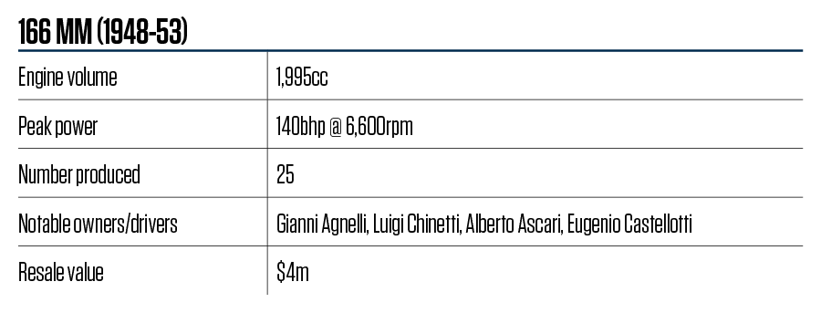 As with all early Ferraris, the 166 MM’s nomenclature was functional: 166 cubic centimetres was the swept volume of one of its 2-litre V12’s cylinders, while ‘MM’ stood for Mille Miglia, the epic 1,000-mile road race won by Ferrari earlier that year. Just 25 were bodied in hand-beaten aluminium by Milanese coachbuilder Touring using its patented ‘superleggera’ (super light) technique.
