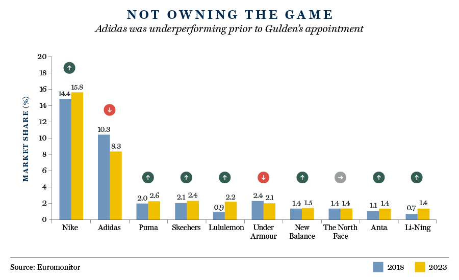 Compounding these woes were a troubled strategic pivot to a direct-to-consumer business model and a huge inventory overhang that necessitated heavy discounting. Fighting fires on a number of fronts, Adidas was struggling to keep pace with the competition, losing market share to both established rivals and a slew of up-and-coming challengers.