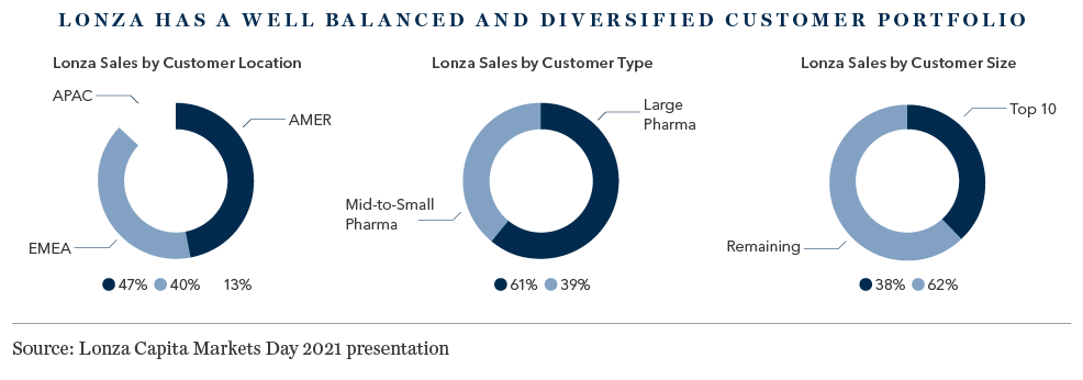 For pharmaceutical and biotech companies, selecting a CDMO is a significant strategic decision. Technical competence, operational flexibility, risk management capabilities, and a proven track record of delivery and compliance are key considerations. Once a trusted relationship has been established, however, they tend to last. Only rarely will a customer switch CDMO, providing the latter with a stable and recurring revenue stream. More than two-thirds of Lonza’s revenues are highly predictable, underpinned by long-term contracts.