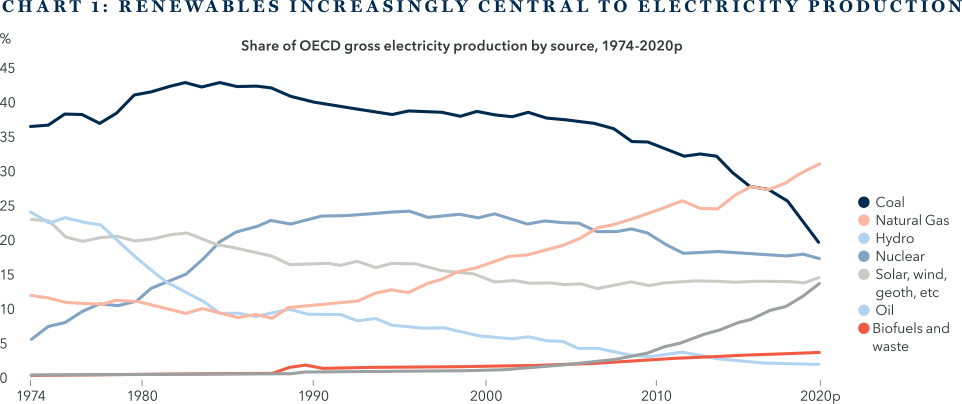 More electricity is now sourced from renewable sources (see chart 1). But whereas natural gas, coal and nuclear have consistent electricity generation profiles, those of solar and wind, the most prevalent renewable sources, are variable. This intermittency poses a challenge, given grids rely on consistency. Grids must retain sufficient capacity to meet peak demand; even a small deficit for short amount of time can result in blackouts.