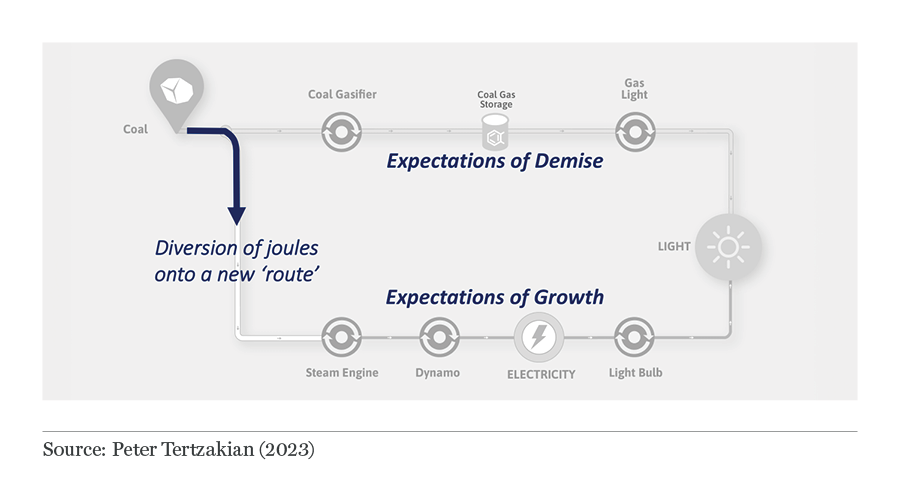 A light bulb converts electrical energy into light energy. The background infrastructure everywhere in our modern society has thousands of conversion devices. So, in energy transition, it is not simply a case of going from coal gas light to electric light or combustion vehicle to electric vehicle. It involves a wholesale change in a system’s supply chain.