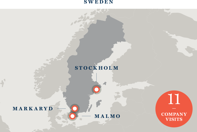From Finland, we travelled to Sweden’s capital Stockholm before moving on to Markaryd and finally Malmö on the country’s southern tip. As in Finland, Swedish management teams learn early to look beyond their own borders in pursuit of larger global opportunities. As the CEO of Thule explained “our website was in 23 languages from an early stage”. Based in Malmö, Thule designs and manufactures transportation and outdoor activity related products – think roof racks and car boxes, and increasingly car seats and strollers too. Today, its core brand is sold in 140 markets across the world.