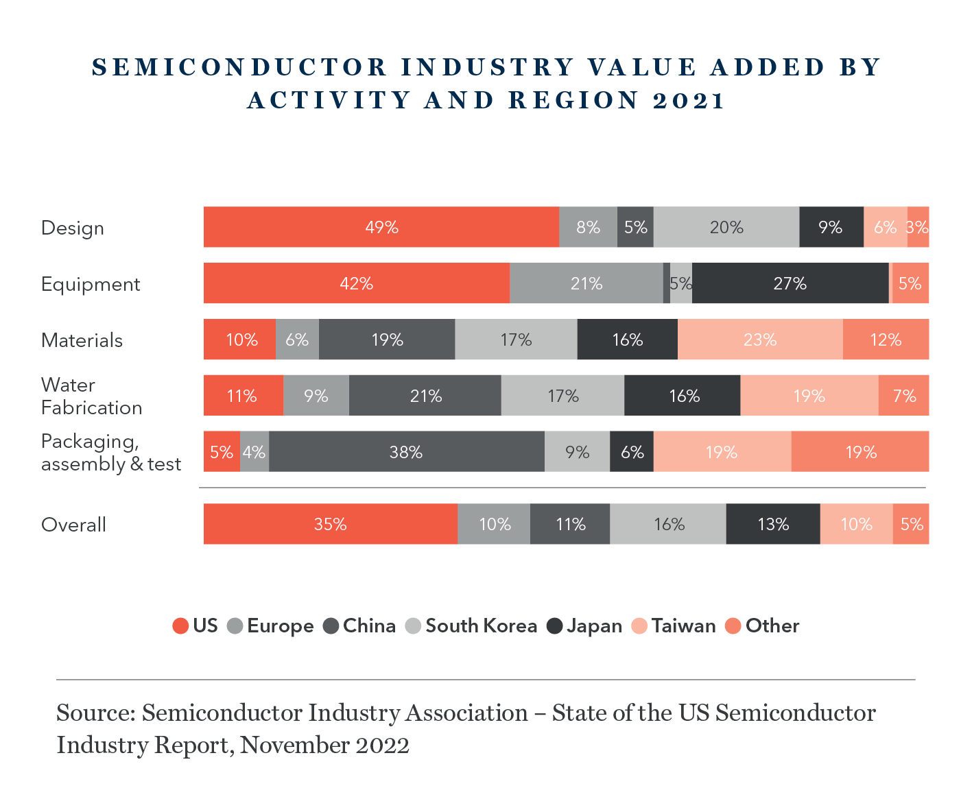 The US semiconductor industry maintains leadership in the activities that are most R&D intensive such as design software, chip design and equipment. As the table below shows, looking across much of the rest of the industry value-add chain, Asia is dominant.