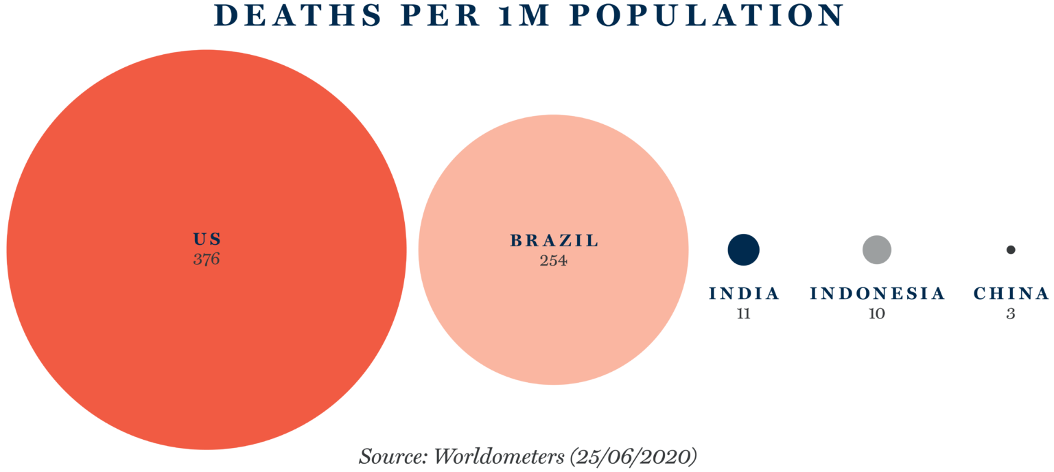 If you then look at countries like Brazil or India or Indonesia, you see a very different picture. While we have seen various short-term measures, sustained lockdown is not a viable option for many of these countries due to high population density and the economic reality that many people cannot afford to stop making money.