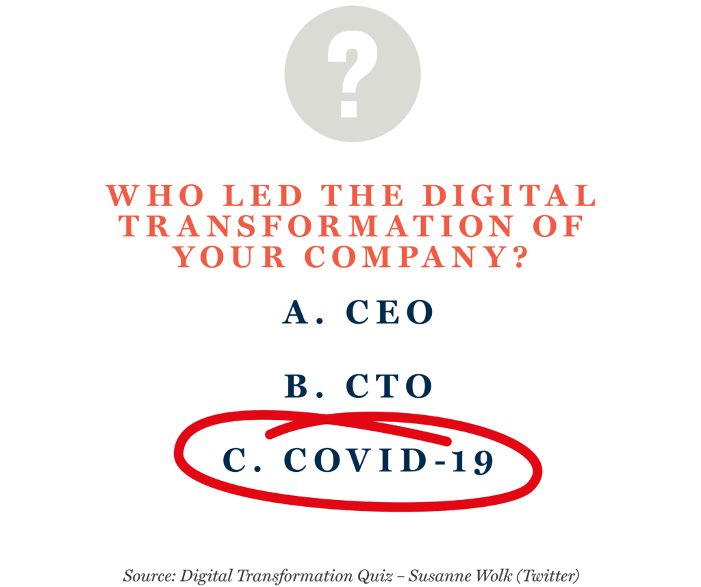 Jamie Zegleman: The meme “Who led the digital transformation of your company?” has been doing the rounds for a while now on the internet and really captures perfectly how Covid-19 is impacting corporations. In a world where your customers can’t come into your shops or your employees can’t come into your office, you need a robust digital backbone to continue doing business, and corporations are investing in this right now.