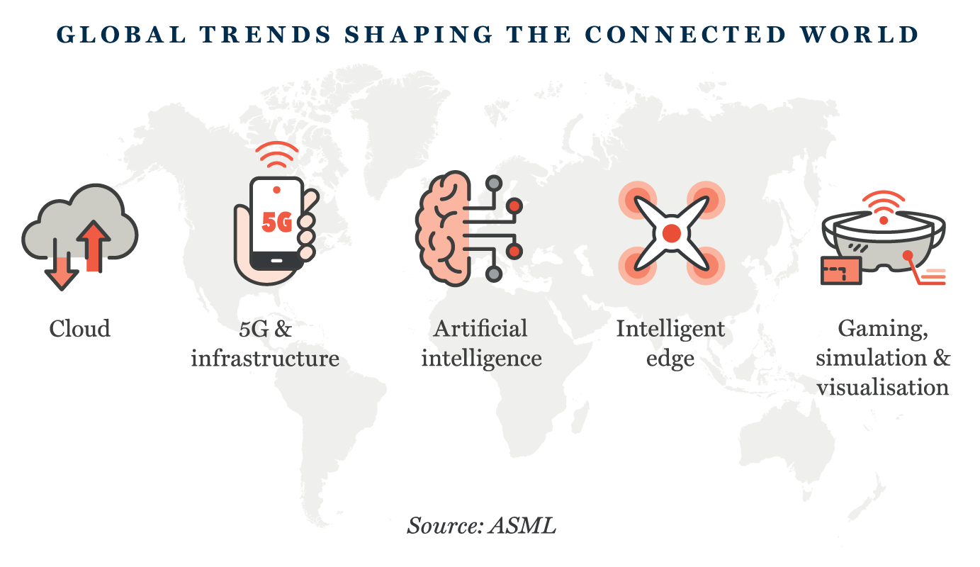 This voracious appetite for data and greater connectivity are powerful drivers for the semiconductor industry, where growth is being fuelled by the expansion of the ‘cloud’, 5G and its associated infrastructure, artificial intelligence, gaming, simulation and visualisation and the intelligent edge. The latter refers to edge devices that collect, communicate, generate, and analyse data in near real-time, for example, sensors, autonomous cars, GPS receivers and navigation systems. There are around 40 billion connected devices in use today, and that number is expected to grow to 350 billion in the next ten years according to semiconductor lithography company ASML.
