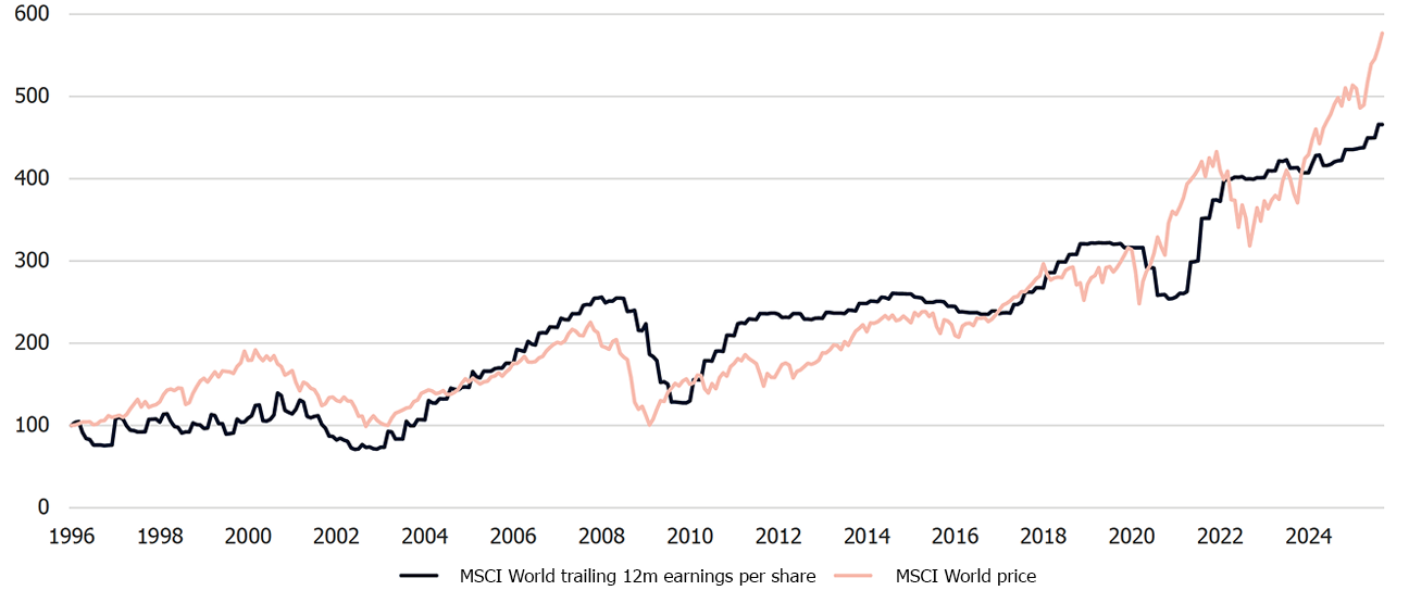 Source: Bloomberg, MSCI, 30 September 2025. MSCI World EPS and price in USD rebased to 100 on 31 January 1996.